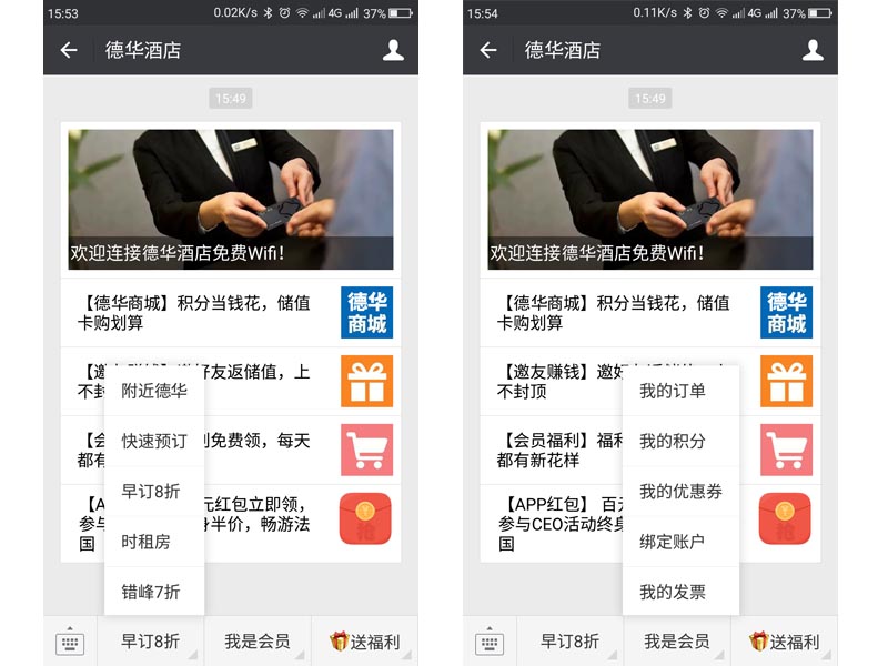 根据微信openID建立会员體(tǐ)系,告别工作人员推销和登记流程,在住店(diàn)流程中使用(yòng)微信或活动中接触酒店(diàn)公众号,即成為(wèi)酒店(diàn)“泛会员”(会员资料填写环节后置)通过微信“卡包”、微信消息等能(néng)力,对“泛会员”进行精准引导,升级会员等级,加强会员粘性。